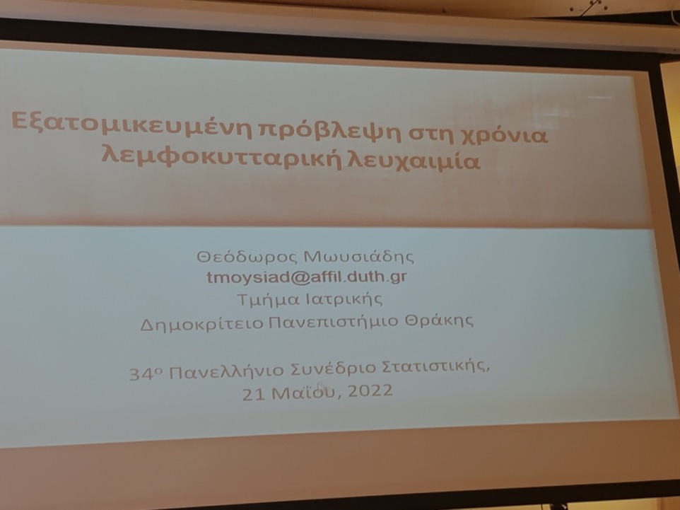 Our first results regarding Personalized Prediction in Chronic Lymphocytic Leukemia were presented at the 34th Panhellenic Statistics Conference hosted by the Agricultural University of Athens (AUA) in Athens, Greece, 19-22, May, 2022. It was a great pleasure to participate in the Conference, and I would like to thank you all for your warm welcome, and for your interest in our work.